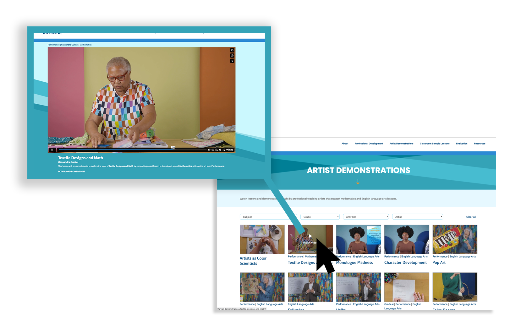 Real time virtual lessons co-taught by the classroom teachers and teaching artists demonstrate the Arts Link arts integration model with students in 2nd through 5th grades learning mathematics and English Language Arts.